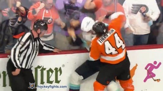 In the first double fight night in Seattle Kraken history, this is left over from the aforementioned Nathan Bastian run in with Flyers captain, Claude Giroux. Nate Thompson is the early clubhouse leader in this one as I don’t know how anyone without the last name Bastian, could think he won that one. An absolute clinic here from Thompson.