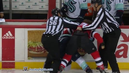 This is more like it, the boys came together with five fights between ten different combatants, for six different teams. I say six different teams, but the expansion Seattle Kraken are rapidly becoming a focus of the NHL’s fists, with three more fights to their total tally of six so far on the season. For you, our valued viewer, each day we have fights aplenty, we will be here for you with our hands outreached, and ready to show you all of the FIGHTS from last night – October 19th: