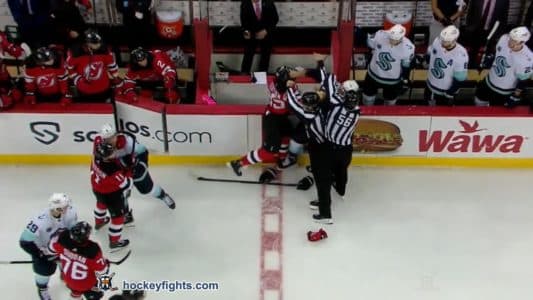 When I pick the screen grabs for the fights, I try and tell the story of what happens in the fight in one picture. The linesmen blocking out the sun here is pretty consistent with how this fight was snuffed out pretty quickly. The Kraken upset the Devils on this night. The highest rated fight of the game, by far.